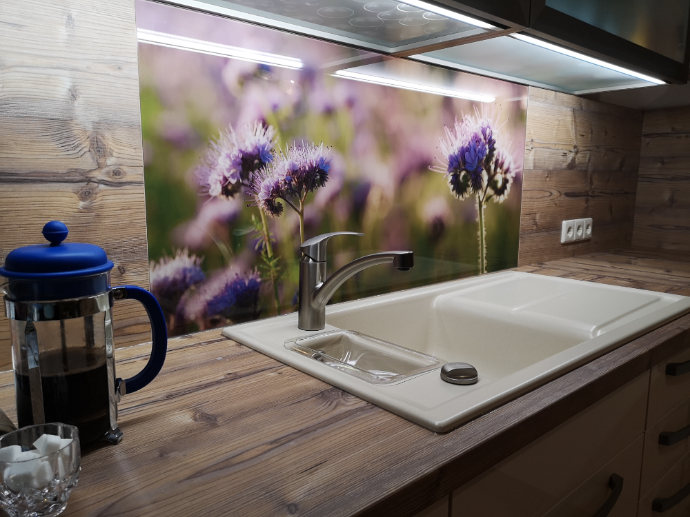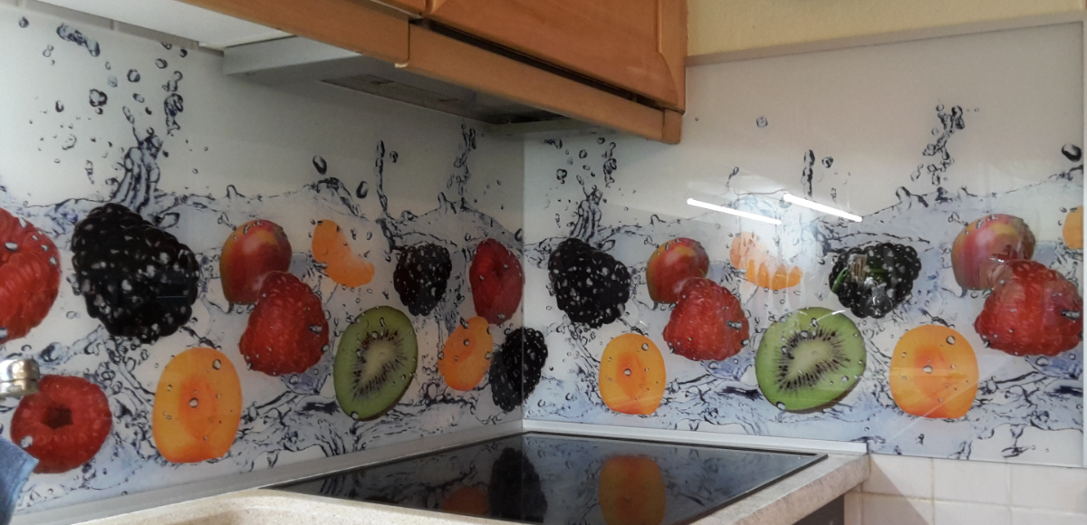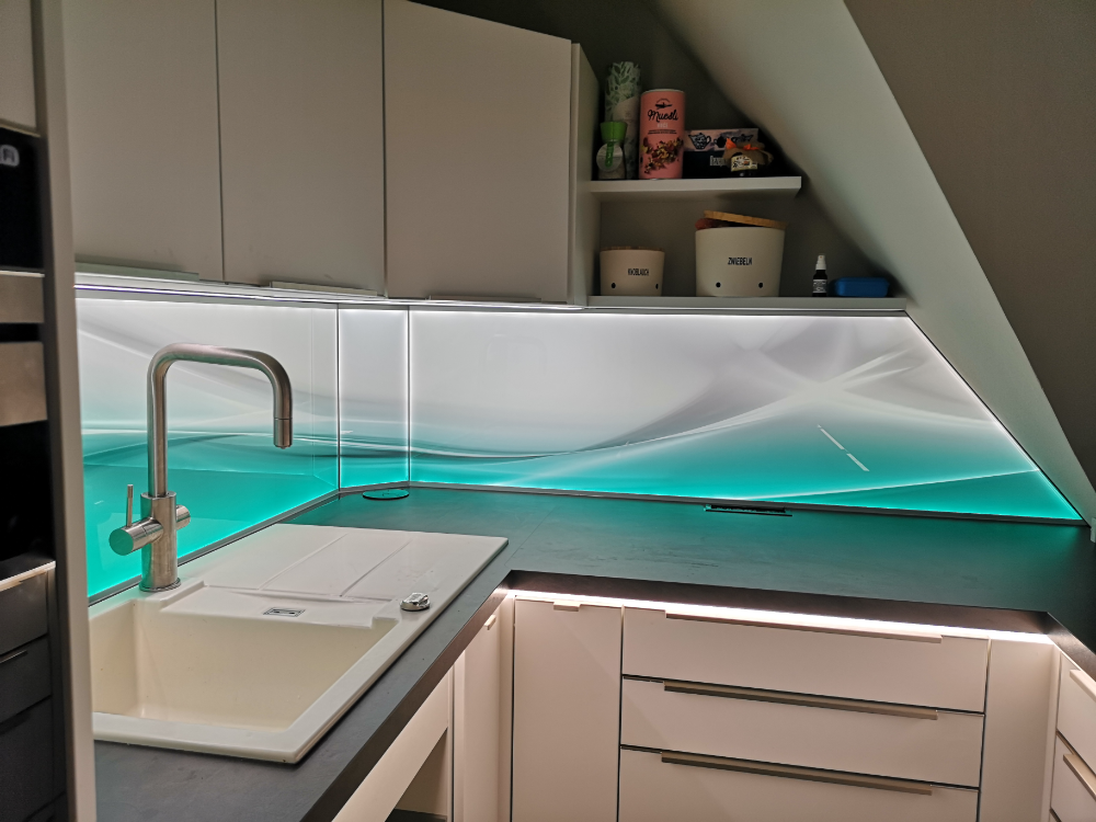 • Gestalten Sie Ihre Küche mit einen individuell angefertigten Motiv, von hinten auf die Küchenrückwand gedruckt. Hierfür sind keine Grenzen gesetzt.